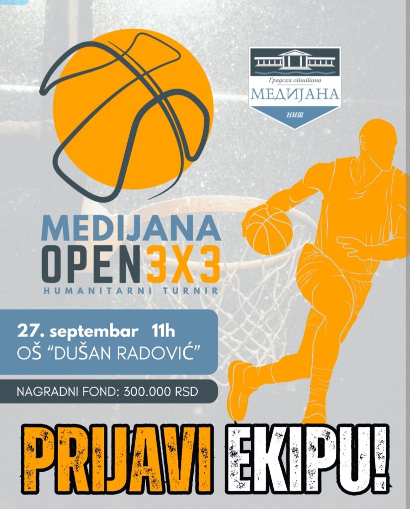 Gradska opština Medijana organizuje prvi „Medijana Open 3×3“ humanitarni turnir u basketu, koji će se održati u subotu, 27. septembra 2025. godine, sa početkom u 11 časova, na terenu OŠ „Dušan Radović“ u Nišu.